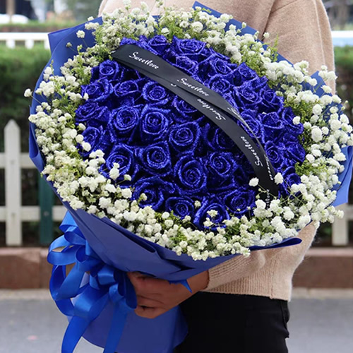 材 料: 33枝蓝色妖姬玫瑰,白色满天星、黄莺外围。黑色丝带装饰!