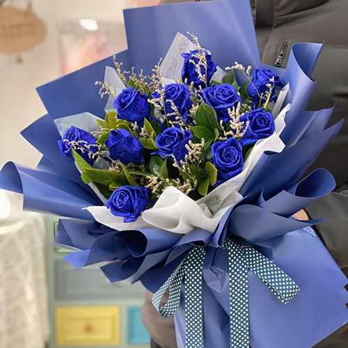 [材 料]:11枝蓝色妖姬玫瑰,情人草、栀子叶搭配