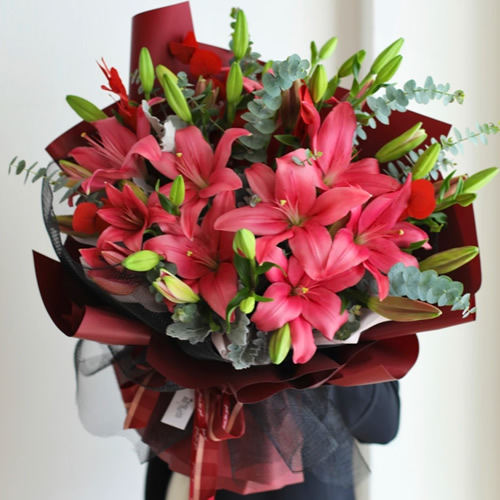 花 语: 红宝石百合花语是热烈的爱,红色的花朵看起来十分喜庆,经常和康乃馨搭配来赠送给母亲,以此来表达人们对于母爱的爱!