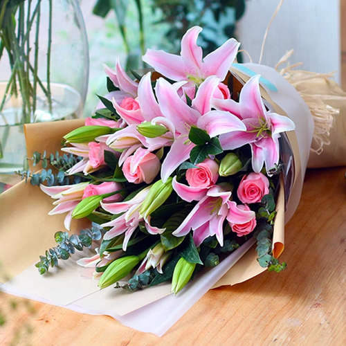 材 料: 6枝多头香水百合,9枝苏醒粉玫瑰、白色雏菊、尤加利叶搭配