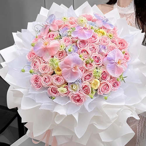 52枝粉雪山,5枝白玫瑰,6朵白色蝴蝶兰喷色