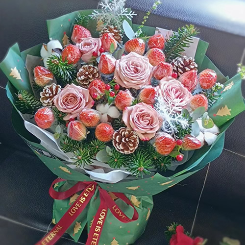 [材 料]:5枝卡布奇诺玫瑰、21颗草莓、5个松果、3朵棉花,2朵雪花、红豆、尤加利叶、诺贝松搭配