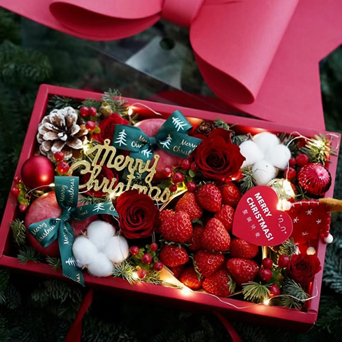 材 料: 15颗草莓、5朵红玫瑰、2个苹果、2朵棉花、1个松果、2个红色圣诞装饰球、Merry Christmas装饰牌、灯串