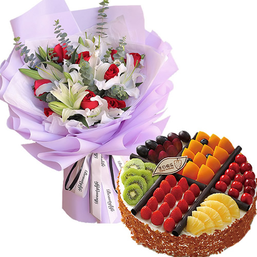 材 料: 9枝红玫瑰,4枝多头白色香水百合,尤加利叶搭配+8寸水果蛋糕