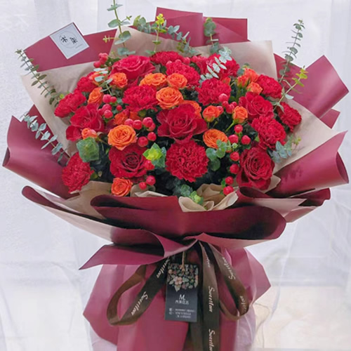 [花 语]:热烈的红色康乃馨,配上暖暖的红色系包装,徜徉在的幸福的花园里,温暖在心里涌起,明媚的阳光悄然洒满我们的心底!