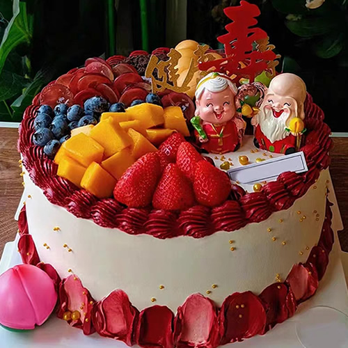 [材 料]:8寸圆形鲜奶水果蛋糕,时令水果、男女寿星套件装饰
