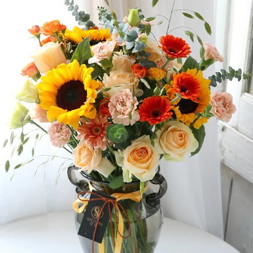 [材 料]:8枝香槟玫瑰,3枝向日葵,3枝橙色扶郎,3枝粉色扶郎,10枝粉色康乃馨,橙色多头玫,绿色洋桔梗,小盼草,尤加利叶搭配