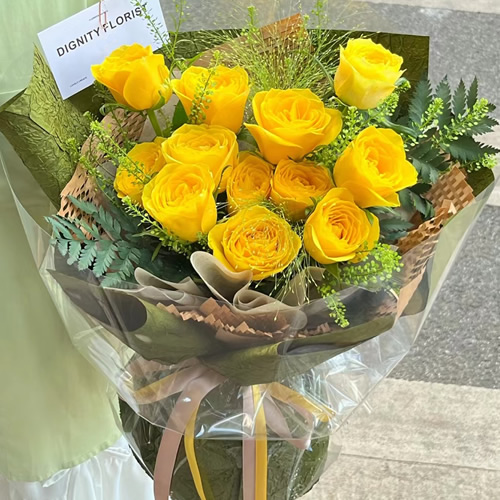 [材 料]:11枝月光漫步黄玫瑰,喷泉草、高山羊齿、雪柳叶搭配[包 装]:咖啡色手揉纸,咖啡色蜂窝纸、绿色纸、透明玻璃纸精美包装,咖啡色、黄色缎带花结束扎[花 语]:你的出现就像一道光,喜欢黄色,充满了活力与希望![适合场合]:友情,道歉[说 明]:您至少应提前3小时下订单,我们保证按时送达; 为了能够有充分的时间准备,我们建议您尽早预定。