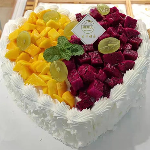 [材 料]:8寸心形鲜奶水果蛋糕,时令水果装饰