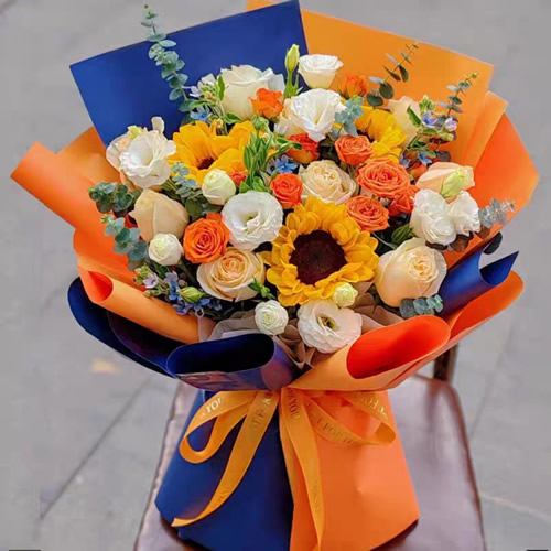 材 料: 9枝香槟玫瑰,3枝向日葵,橙色多头玫,白色洋桔梗,蓝星花,尤加利叶搭配