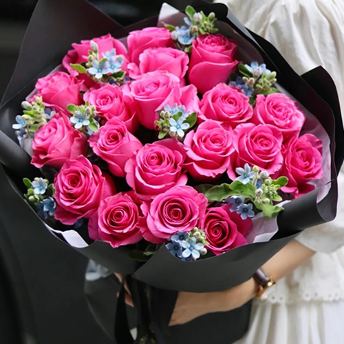 [材 料]:19枝弗洛伊德玫红玫瑰,蓝星花搭配