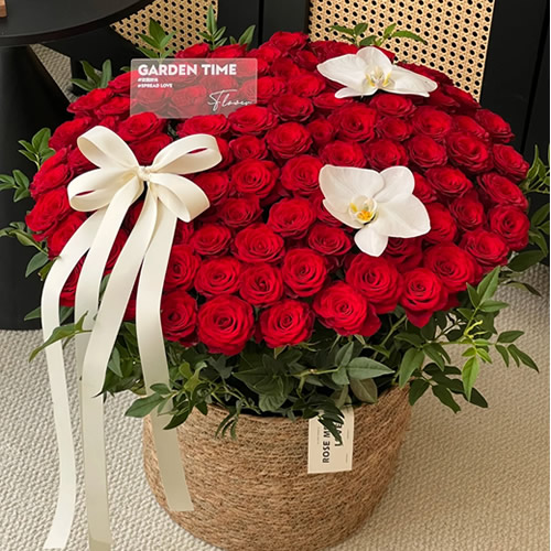 [材 料]:99枝高原红红玫瑰,2朵白色蝴蝶兰,丝带花结装饰,九星叶