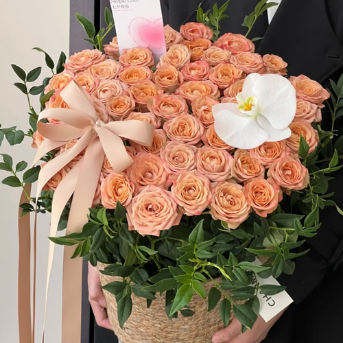 材 料: 52枝卡布奇诺玫瑰,1朵白色蝴蝶兰,丝带花结装饰,九星叶