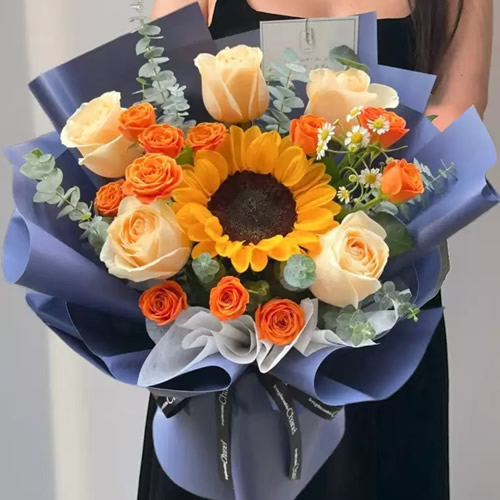 材 料: 5枝香槟玫瑰,1枝向日葵,橙色多头玫,洋甘菊,尤加利叶搭配