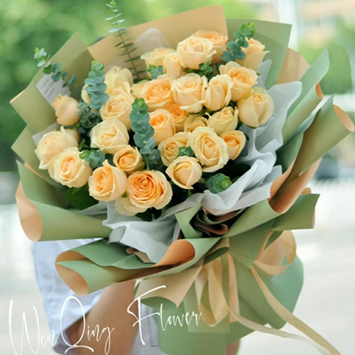 [材 料]:33枝香槟玫瑰,尤加利叶搭配