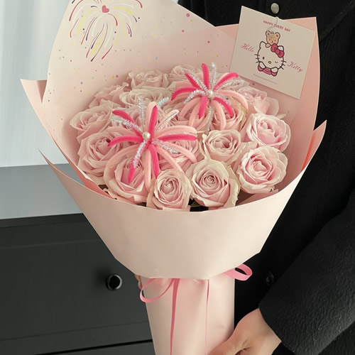 [材 料]:19枝粉雪山玫瑰,2个扭扭棒烟花装饰